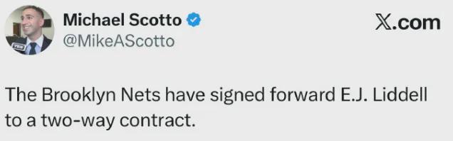 近日篮网与EJ-利德尔签约双向合同,算上之前同样已经签约双向合同的艾蒂安,现在球队只剩下一个双向合同名额。