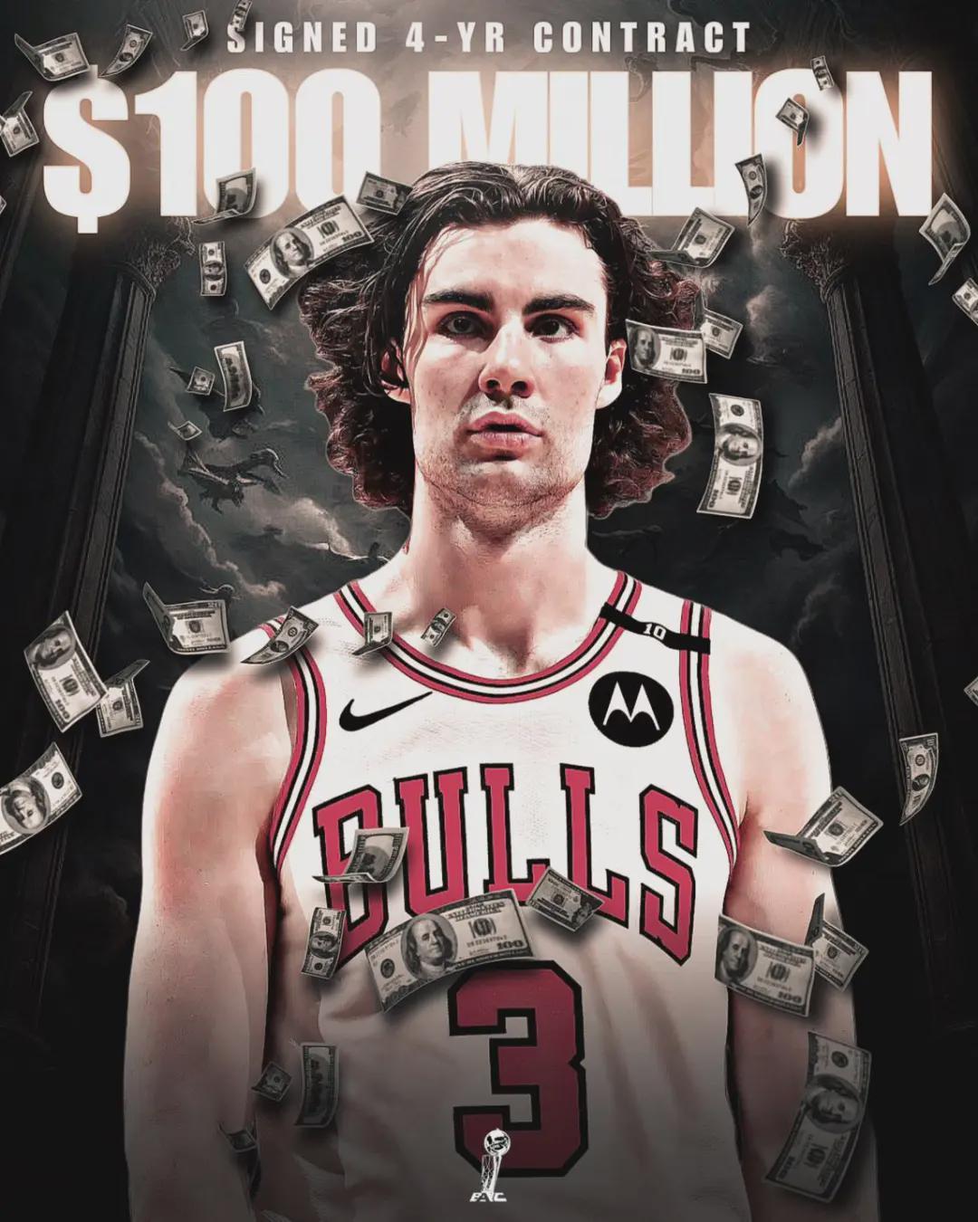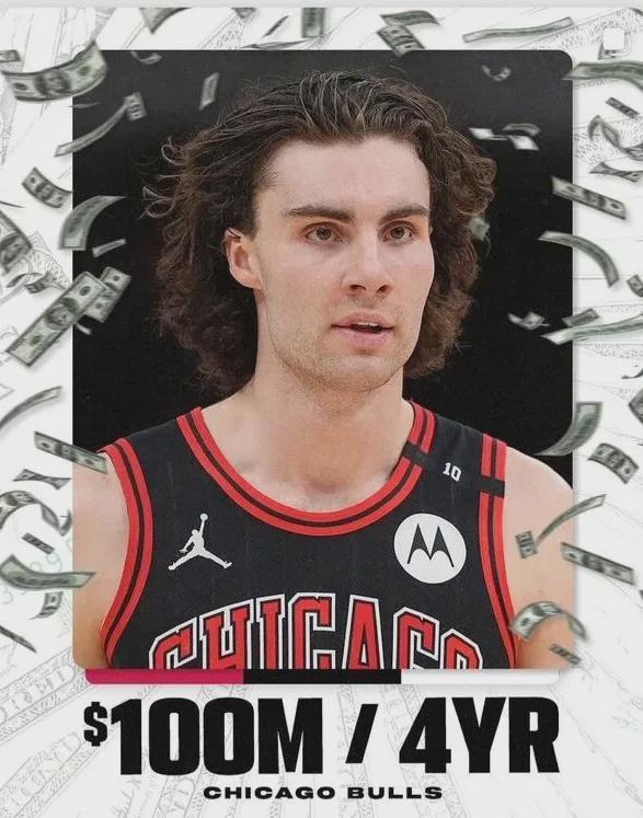 最终,吉迪跟公牛各退一步,接受了4年1亿美元的续约合同,平均年薪是2500万美元,还行吧,在现如今通货膨胀的NBA真算不上贵了。